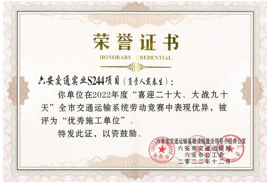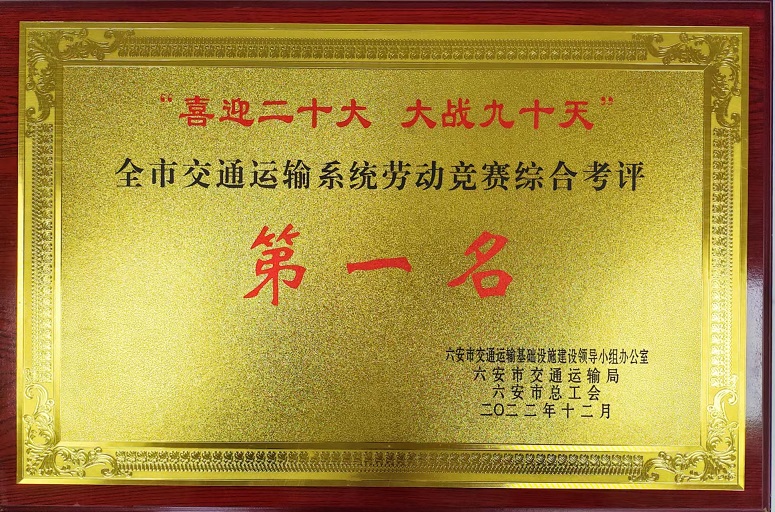 近日,公司在六安市交通運(yùn)輸局和六安市總工會(huì)組織的“喜迎二十大、大戰(zhàn)九十天”全市交通運(yùn)輸系統(tǒng)勞動(dòng)競(jìng)賽綜合考評(píng)中獲第一。同時(shí)參與建設(shè)的S244羅崗至分路口段公路工程(二期)03合同段項(xiàng)目和G237六安馬頭至舒城萬(wàn)佛湖工程(一期)項(xiàng)目在勞動(dòng)競(jìng)賽中被評(píng)為“優(yōu)秀施工單位”。