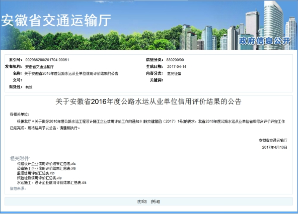 2017年企業(yè)信譽(yù)等級證明材料安徽省交通運(yùn)輸廳AA級信譽(yù)等級查詢網(wǎng)址:
